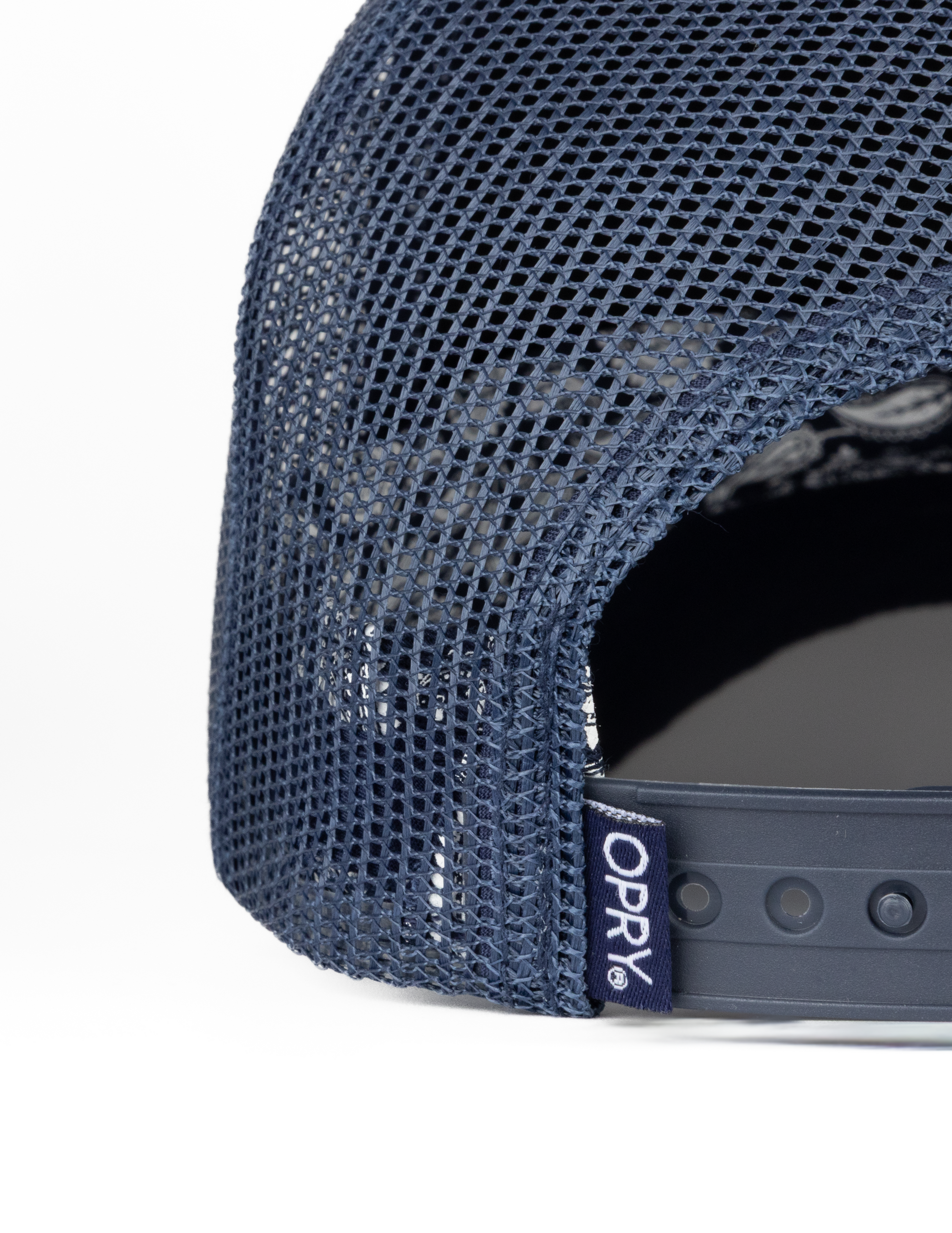 A little sparkle, a lot of country pride. This mesh-back navy trucker hat features a rhinestone American flag front that catches the light from the stage to the tailgate. Designed with a foam front and curved foam bill for a classic retro fit, it’s finished with “How-Dee” embroidery on the brim and a paisley-printed interior sweatband for a subtle feminine touch. A woven Opry clip label at the back completes the look.